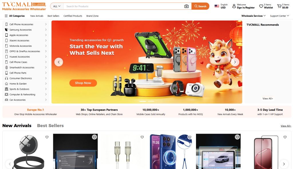 If you want to focus purely on accessories, TVC-Mall accessories has a massive catalog of over 1 million SKUs. There is no MOQ on 95% of their items, and they operate warehouses in Europe, Asia, and the US.